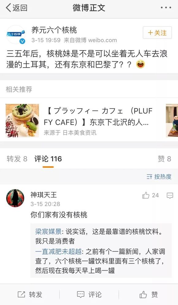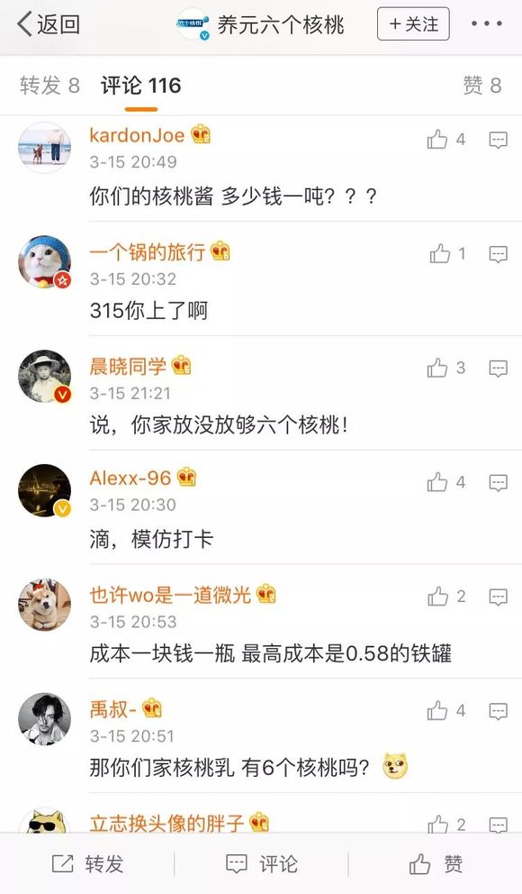 目前六个核桃官微下置顶在最前面的评论是“质问”它家:“你们家有没有核桃”,大部分都是过来帮六个核桃“滴315卡”的:“说,你家放没放够六个核桃”的“热心网友”。