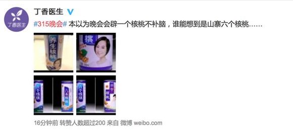 晚会还未结束时,丁香医生官微发文称:本以为晚会会辟一个核桃不补脑,谁能想到是山寨六个核桃,并打上“315标签”。