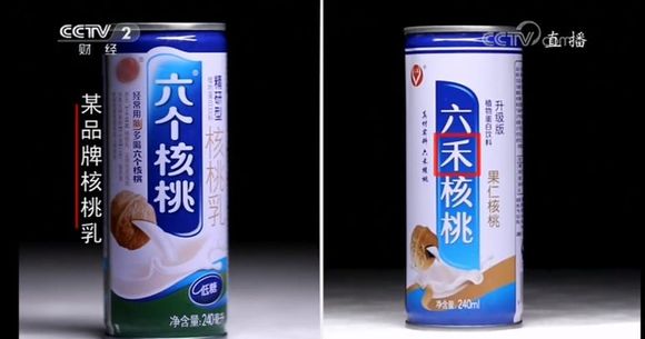 不难发现,上述视频里播出的产品,除了在产品类型上跟风模仿,有的公司在外包装上也是煞费苦心,产品都和某品牌核桃乳非常相似:6个纯核桃只多了一个字,6斤核桃还有6禾核桃只是一笔一划的差距,外装设计、构图也是这些企业模仿的对象,让人难以分辨。