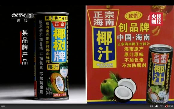 上述暗访视频中还播出了某品牌的红牛饮料,模仿的带有红牛字样、外包装设计和某品牌相似的跟风产品。还有某品牌的椰汁产品,也是模仿的,大都冠以正宗海南字样。