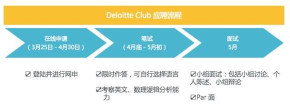 德勤俱乐部的应聘流程主要分为网申、在线笔试、面试三大部分,最终录取类型有三种,一是进入德勤俱乐部,二是纳入德勤实习生库,三是获得 early Par 面。