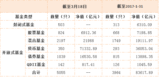 由于截至2017年1月底公募基金的数量已达到3964只,将近4000只,因此我们直接采用了协会2017年1月的公募基金市场数据,其余数据均来自Wind。由于统计口径的差异,截至3月18日,Wind统计的封闭式基金资产净值与官方数据有一定差距,所以这里不详细列出,仅重点来看看其他几类基金的增长情况。