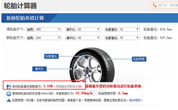 那么如何知道新旧轮胎直径差呢?在百度里输入轮胎计算器,按照提示录入数据就ok了。我们拿文章开头的提问举个例子: