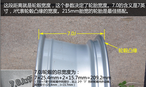 您的轮毂适合怎样的轮胎宽度,是由J值(轮毂宽度)决定的,J值是指轮毂两侧凸缘之间的距离。如右图,新轮毂中的7.0J,“7.0” 指的是7英寸,“J”代表轮毂凸缘的形状和高度(还有C、JJ、JK、K 等高度,C为最低,K为最高)。轮毂宽度决定了可安装的轮胎宽度,对照上表数据可以知道。