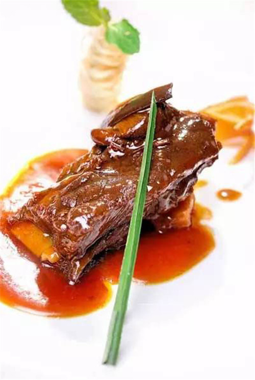 4、另起锅,下卤水原汁100克、黑胡椒碎、湿淀粉勾芡,淋上原油(即卤水中飘浮的油脂,突出牛肉的原汁原味),浇在牛排和灵芝片上,分别用装饰料点缀即可。