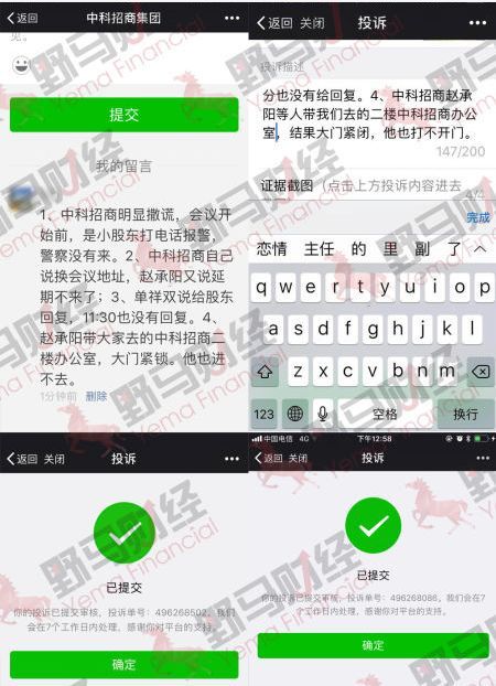 部分小股东对中科招商公开回应投诉的截图