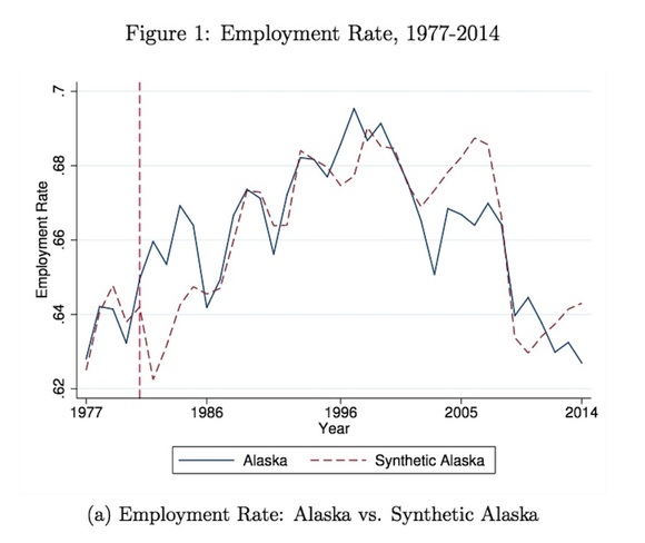 为了对比该项目实施前后阿拉斯加的变化,芝加哥大学经济学家Damon Jones和宾夕法尼亚大学经济学家Ioana Marinescu选择了一些1982年之前就业模式和数据与阿拉斯加近似但没有实施现金发放项目的州,人为合成了一个“阿拉斯加”,并与真实的阿拉斯加进行了对比。