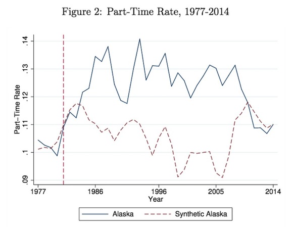 但在另一个指标上,他们发现了区别,那就是兼职率。从下图可见,与“合成版阿拉斯加”相比,1982年后,阿拉斯加的兼职率明显要高,这说明现金发放项目增加了兼职的比率。