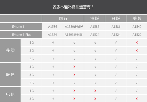 美版:无锁版型号是iPhone6 (A1549),iPhone 6 Plus(A1522)。联通通吃,电信4G可用,移动没戏。价格比日版略高一些。此外美版还会有运营商的合约版,如Verizon和Sprint版,只允许用户在合约期内使用该运营商的网络,买时要注意。
