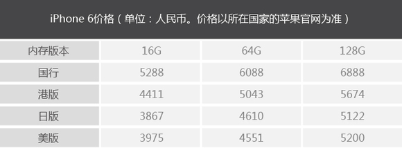 国行:价格上最坑爹(价格平均比同类同内存最低的价格高出1600元)。不过全网通吃,且售后有保障。全网通吃指的是在移动、联通和电信的2G、3G和4G中都可以使用,而且可在大陆保修,免去越洋之苦。型号为A1586的iPhone 6和型号为A1524的iPhone 6 Plus,应为国内的公开版。国行里还有两个型号,iPhone 6 A1589和iPhone 6 Plus A1593,由于支持移动的GSM/TD-SCDMA/TD-LTE网络,漫游时支持WCDMA和LTE FDD网络,或为移动定制机。