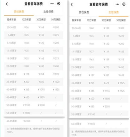 无论男性女性,29岁及以下年龄投保微医保·重疾保障,10万元保障首次投保保费均不足百元。50万元保额的最高投保年龄44周岁,投保50万的保微医保·重疾保障,男性只需1825元,女性只需1925元。好医保·重疾保障没有在投保页面披露费率表,不过以一位25岁的女性为例,投保50万好医保·重疾保障(全面版)和微医保·重疾保障分别需要425元、450元,后者略贵25元。