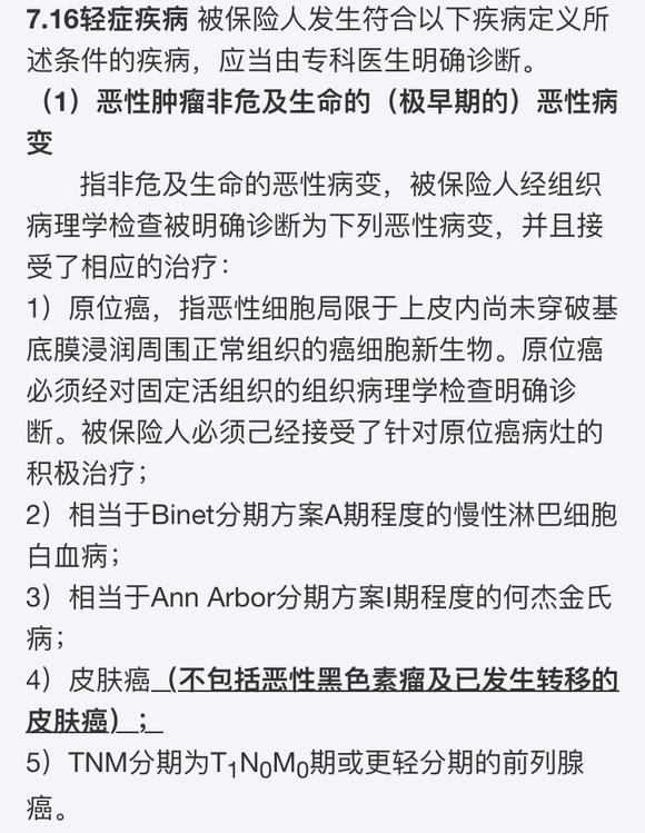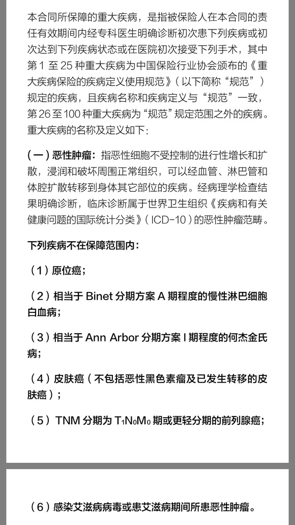 举个例子,如上图包含原位癌、皮肤癌(不包括恶性黑色素瘤及已发生转移的皮肤癌)等6种恶性肿瘤属于微医保·重疾保障的除外责任,这部分也同属于好医保·重疾保障(全面版)100种重大疾病的除外责任。