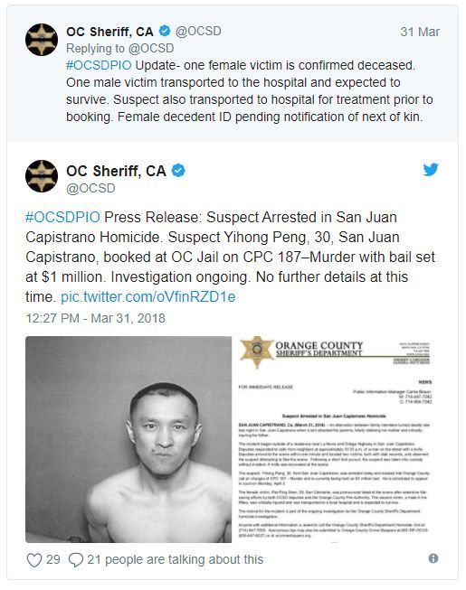 3月30日晚10:30左右,橙县(Orange County)圣胡卡皮特诺市 (San Juan Capistrano) 发生命案。30岁华裔男子彭亦宏(Yihong Peng,音译),涉嫌刺死其母亲沈蔚萍(Wei Ping Shen,音译)并致使父亲重伤。
