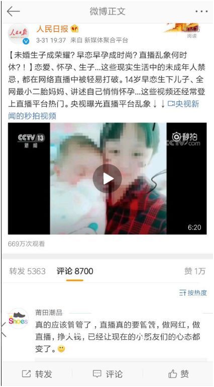 本次CCTV13新闻直播间节目中,曝光内容主要针对早孕网红,低龄生子的现象。