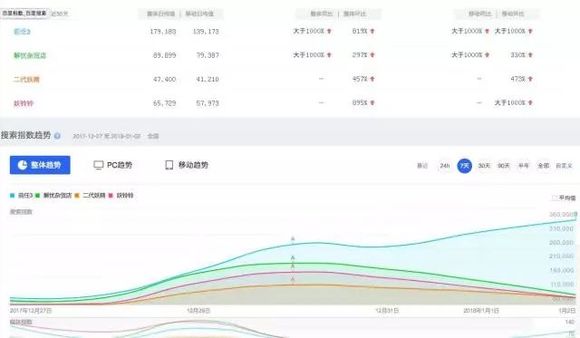 那么此次联合宣发给电影票房、口碑带来多大的贡献呢?我们不妨看下电影上映当天的一个数据。微信和百度的搜索指数数据显示《前任攻略3》在热度上吊打同期几部片。如果时间回到2017年12月29日,估计当时没有一个人会想到,《前任3》会在同天上映的4部电影中杀出重围。