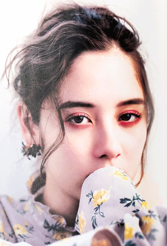 眼妆部分她只用了蜜桃色的眼影提亮,然后刷上睫毛膏就搞定了。干干净净的眼妆,反而凸显了她的五官。