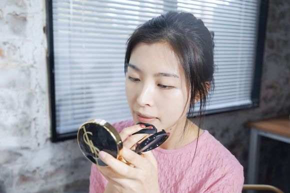 她平常就很爱用气垫,因为上妆快不会失手,出来的妆效轻薄又服帖。
