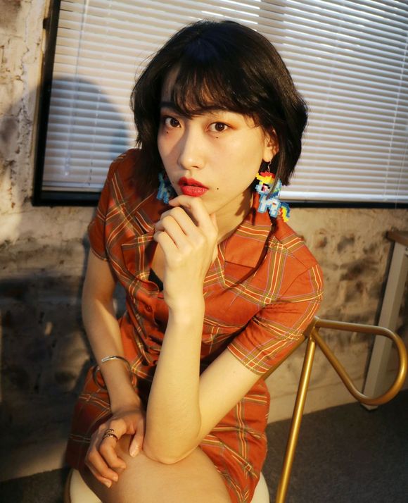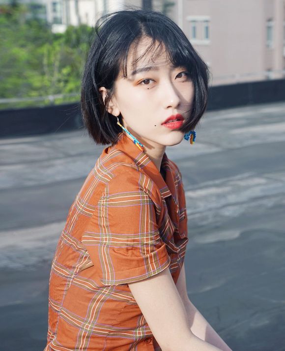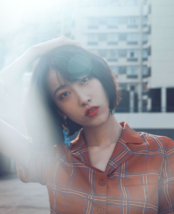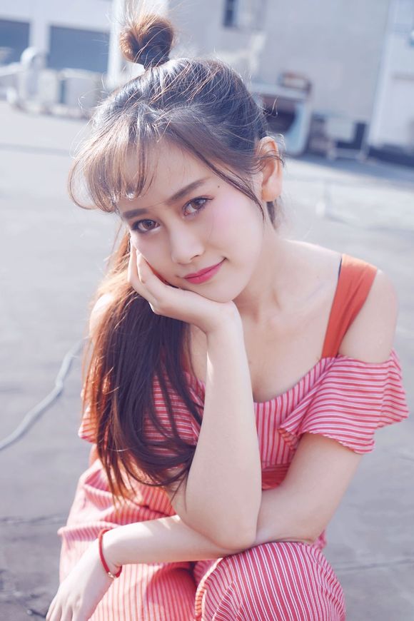 妆容完成之后,她扎了个半丸子头,瞬间变成日系小女生。