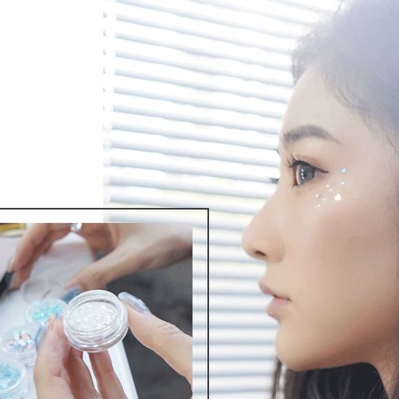 她用的亮片就是淘宝上买的眼妆神器,很适合节日妆用~在眼睛旁边,撒上小闪片和一些银色的三角形亮片,围观的女同事们一直感叹太好看了~
