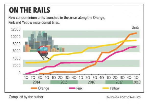 在过去四年中,住宅项目开发商一直在积极购买这三条线路沿线的土地,以满足对公寓建设的需求,并且新公寓供应量一直在稳步增长,尤其是2016年以来,沿着橙色线的地区。