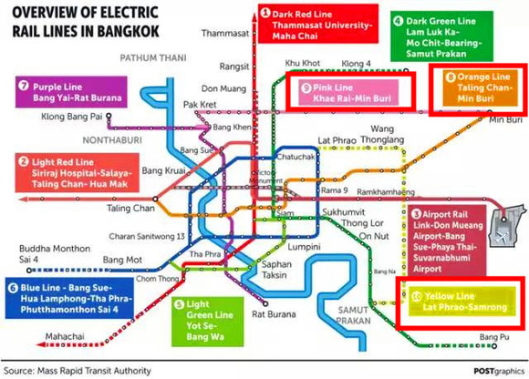 购房者和开发商都密切关注新交通线路橙色、粉色和黄色线的进展,这几条线路一旦建成,将服务于曼谷的北部和东部地区。目前橙色线正在建设当中,而建设黄色和粉色单轨线路系统的开发商已经为这两个项目获得了融资。