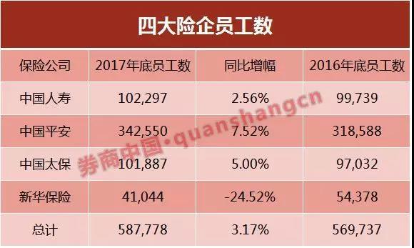 截至2017年底,四大险企合计员工数58.78万人,较 2016年底增加1.8万人,增幅3.17%。其中,新华减员1万多人,另外3家员工有不同增加。