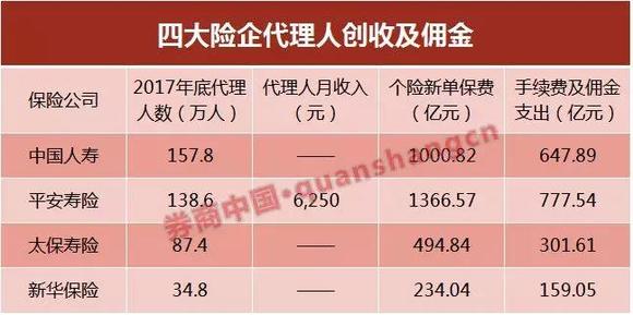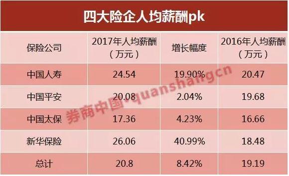 根据A股四大上市险企年报数据,2017年,国寿、平安、太保、新华4家人均薪酬约为20.80万元。
