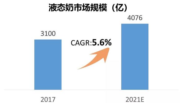 2017年液态奶规模达3100亿,未来五年年复合增长率达5.6%,预计21年市场规模达到为4076 亿元,增长空间巨大。