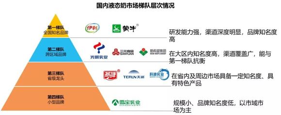 庞大的市场,长距离运输需求让UHT奶占据了市场主导,从而促使基地型奶企迅速成长,诞生了以蒙牛、伊利为第一梯队的四大梯队格局。