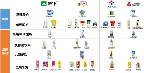 3、四大液态奶品牌在各细分市场均竞争激烈,蒙牛白奶产品布局最为丰富与全面,伊利则重在酸奶产品布局。