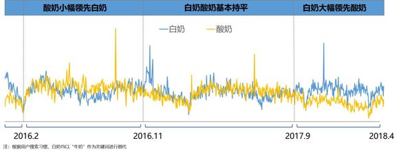 乳品三周期规律:360用户对白奶与酸奶的关注度呈现9-10个月的周期性,会分别出现关注度白奶<酸奶,白奶=酸奶,白奶>酸奶三个周期。