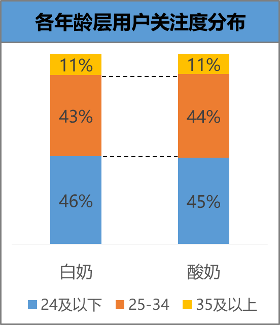 年轻化:对白奶与酸奶关注的360用户呈现显著的年轻化,近9成关注者为35岁以下年轻用户。