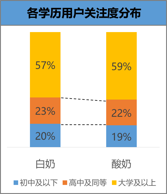 高知化:对白奶与酸奶关注的360用户高知化倾向明显,大学以上用户占比近6成。