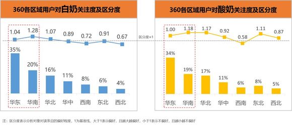 华东、华南的360用户对白奶与酸奶的关注与偏好明显高于其他区域。