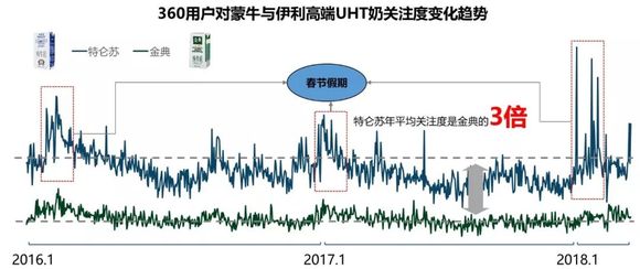 节日周期性:三款常温酸奶作为高端酸奶,在360用户中礼品属性显现,在春节期间关注度均会有大幅上扬。