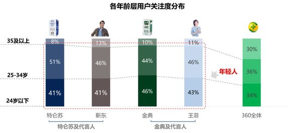 年轻化显现,关注特仑苏、金典的360用户与靳东、王菲的粉丝均以年轻人为主体,尤其是金典用户与王菲粉丝。