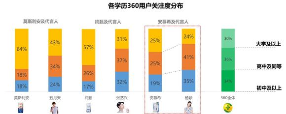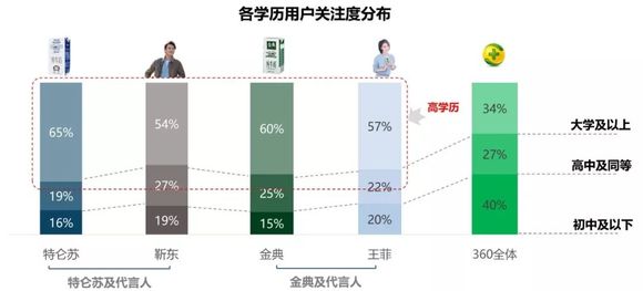 高知化显著,关注特仑苏、金典的360用户与靳东、王菲粉丝均高学历为主体,尤其是关注特仑苏用户。