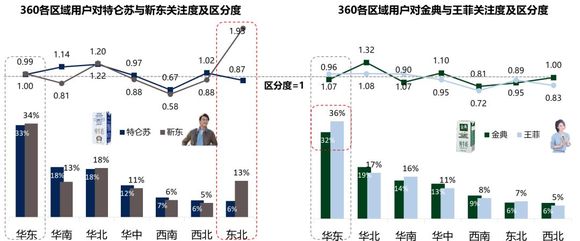 关注特仑苏的360用户与靳东粉丝主要集中在华东地区,但东北地区特仑苏关注者与区分度均远低于靳东粉丝。关注金典的360用户与王菲粉丝主要集中于华东地区,但关注度上与王菲粉丝还有较大差距。