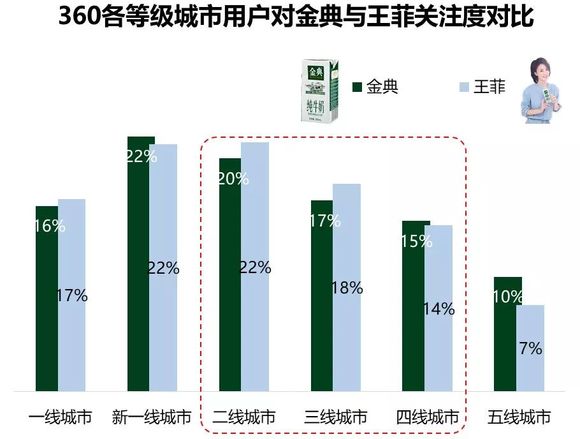 关注金典的360用户与王菲粉丝主要集中于中高线,在中线城市关注度上与王菲粉丝还有较大差距。
