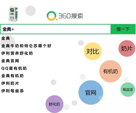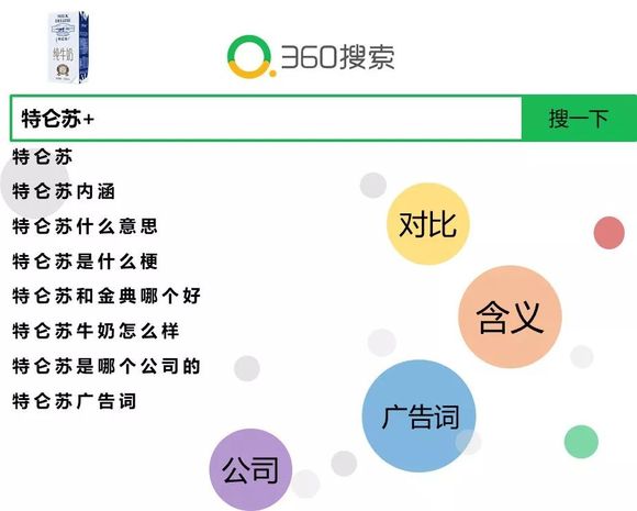 4、360用户搜特仑苏主要关注内涵与广告,搜金典则更关注与特仑苏对比与相关产品。