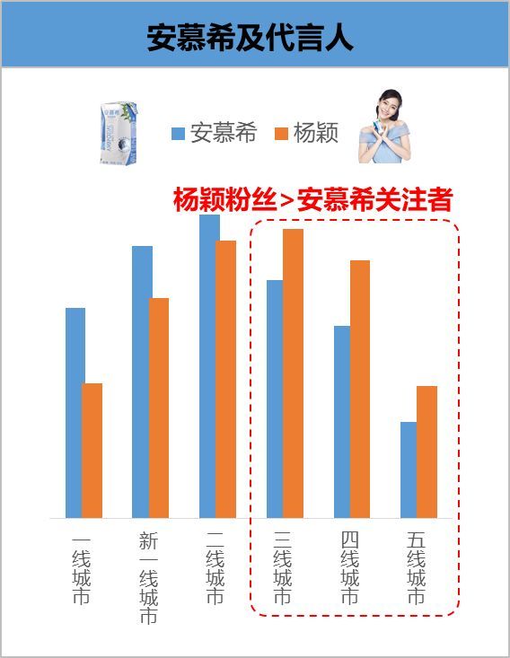 三大常温酸奶覆盖人群学历差异明显,莫斯利安、纯甄以高学历为主,安慕希则覆盖均匀,杨颖的粉丝学历以中低学历为主,安慕希下沉空间广阔。