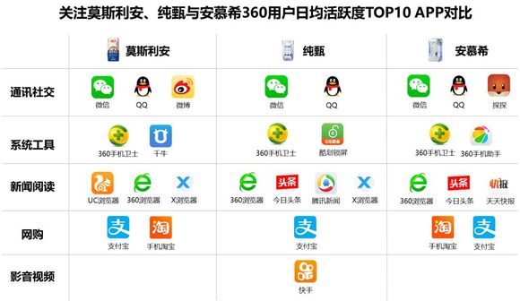 莫斯利安、安慕希用户偏爱通讯社交,纯甄用户则钟情于新闻阅读。