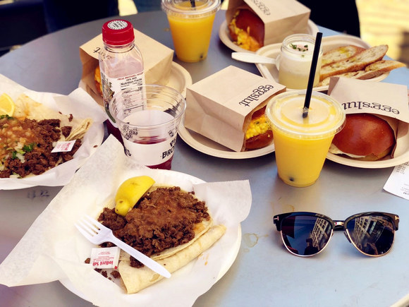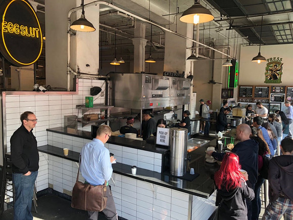 关于中央市场每日的人流量并没有确切统计,但从早8点到晚10点,任何时间走进市场,都能见到如潮水一般的本地食客,以及慕名而来的游人。虽说每个商铺的生意都很红火,然而整个市场里最为火爆的是一家名叫eggslut的鸡蛋主题美式汉堡餐厅,不论工作日还是周末,晴天或是雨天,等着一试美味的队伍能围着整个店面绕一圈。人们选择这家,大多是为了餐牌上的招牌特色炒蛋汉堡“Fairfax”,以及用面包片沾蛋奶混合物的小吃“slut”。当然不管点哪款餐品,主角鸡蛋的鲜美都超乎想象。
