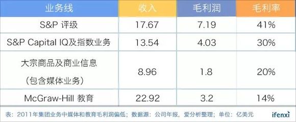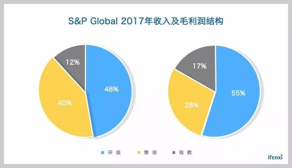改名McGraw-Hill Financial后,由于大宗商品信息服务Platts盈利能力突出,与Caipital IQ合并为市场与商品情报业务,指数业务也拆分成为独立业务线,形成了现今的评级、情报、指数三大业务线,再次更名为S&P Global。2017年集团营收60.63亿美元,毛利率43%,净利率27%。