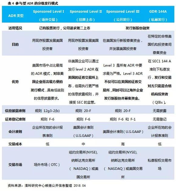 “CDR+”模式的设计将参照已经成熟的美国存托凭证(American Depository Receipt,ADR)模式。在涉及的交易主体中,我们认为依据ADR的交易体系,将涉及六大交易主体(投资者、存托机构、托管人、基础证券发行人、结算机构、证券承销商)。在发行模式上,参考美国参与型(Sponsored)ADR的分级发行体系,共有四种可参考的CDR发行模式(可参考表3),分别是Sponsored Level 1(场外交易)、Sponsored Level 2(挂牌上市)、Sponsored Level 3(公开发行)和GDR-144A(私募发行)。当前在美国上市的中概股多采用Sponsored Level 3的模式上市发行。其中,Sponsored level 2 (参与型非融资)和Sponsored Level 3(参与型融资)两种模式可能将成为主要的CDR发行模式。在融资发行模式下,海外上市公司可以通过定向增发的方式增加基础股票,再通过CDR得到来自中国境内新的融资。非融资模式下,CDR所依托的基础股票将来自于上市公司现存的股票,上市公司并不因为CDR的发行而募集新的资金。清科研究中心认为,这两种方式在当前我国市场环境下都具备较强的可行性,也较为适合我国海外中企的上市。
