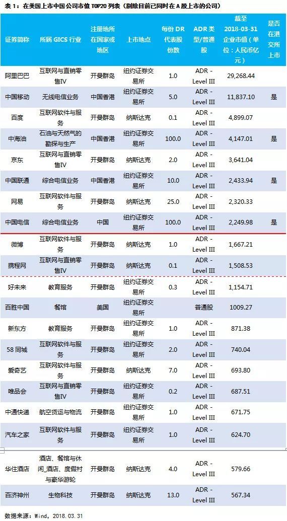 当前,在美上市的中概股则大多采用ADR的形式。根据万德数据统计,截至2018年3月31日,共有186支中国股票在美国上市,其中有近104家企业通过发行ADR的方式在美发行,占比高达55.9%。以中石油,中石化和中国人寿为代表的9家企业在A股和港股发行上市;以中国移动和中海油为代表的6家企业在港股发行上市。在发行方式上,除ADR发行外,其余企业采用直接发行普通股的方式在美国上市。根据《若干意见》,目前只有8家美国中概股符合这一标准。而当前市值位于2000亿以下的微博、携程网近期因受美国股市调整的因素影响,股价均有所跌落,但市值也都超过1500亿元人民币,未来不排除其满足2000亿的市值标准后采用CDR的形式回归国内。清科研究中心认为,对于已在境外上市的企业设置2000亿市值的红线,主要是在上市制度改革初期,监管层使用CDR主要还是针对“BATJ”为代表的龙头企业,有序的将海外优质中概股龙头企业引回国内资本市场。
