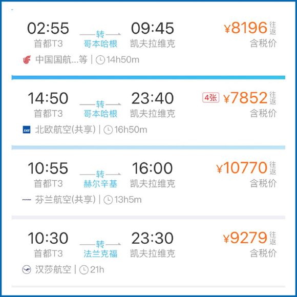 中国目前还没有开通直飞冰岛的航线所以无论你选择哪个航空公司,都需要至少一次中转。而在价格上,如果你能提前很久订票,能便宜一些但不多。也因此,很多人把冰岛当成了欧陆旅行中的一次沿途目的地。