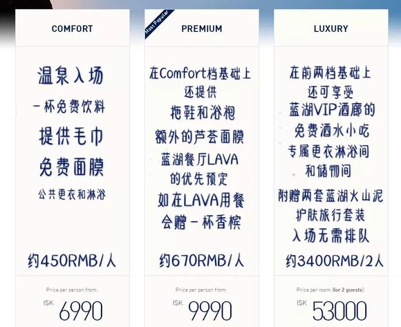 去蓝湖泡温泉一定要提前预订,旺季(夏季5到8月或冬季11到3月)更是要提前1个月以上在官网进行预订。价位分为三档,虽然差距有些悬殊,但如果是两人或多人同行,非常建议选择LUXURY,卫生、舒适、有吃有喝不说,最重要的是,你大概能节省一个小时的排队入场时间。入场建议越早越好,幸运的话,你还能在蓝湖中看到冰岛的日出。