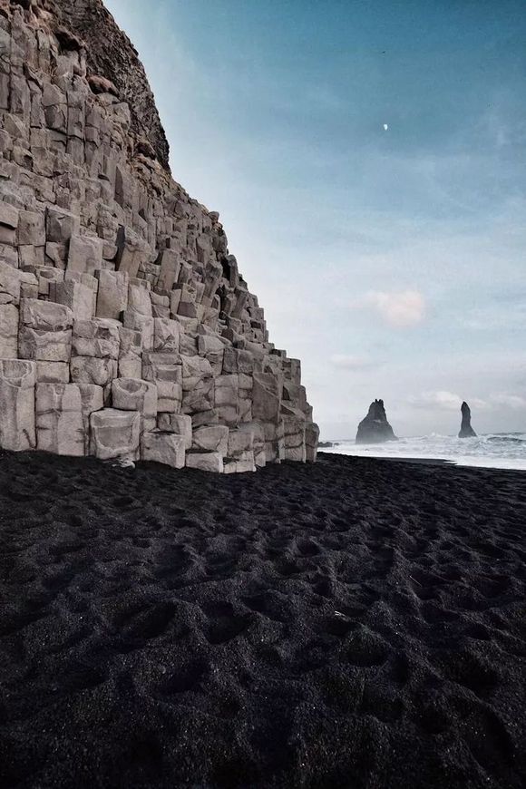 要论黑沙滩的玩法,欣赏风景自然是首要任务。6万年前,大西洋的海底,一股股玄武岩熔岩从地壳的裂隙涌出,冲向海面,堆积形成了最初的冰岛。之后又不断有小火山不定期喷发,熔岩像河流一样流向大海,遇到海水冷却收缩结晶,形成了黑色大小不同结晶体,千百年的冲刷,铺成了黑沙滩。