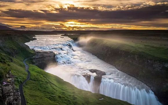 从维克镇出发到黄金瀑布绝大多数时候还是行驶在1号公路上。黄金瀑布位于古老的深谷之中,雄伟的瀑布从平均32米高的地方分为两道滚滚留下,每秒流量最高可达140立方米。